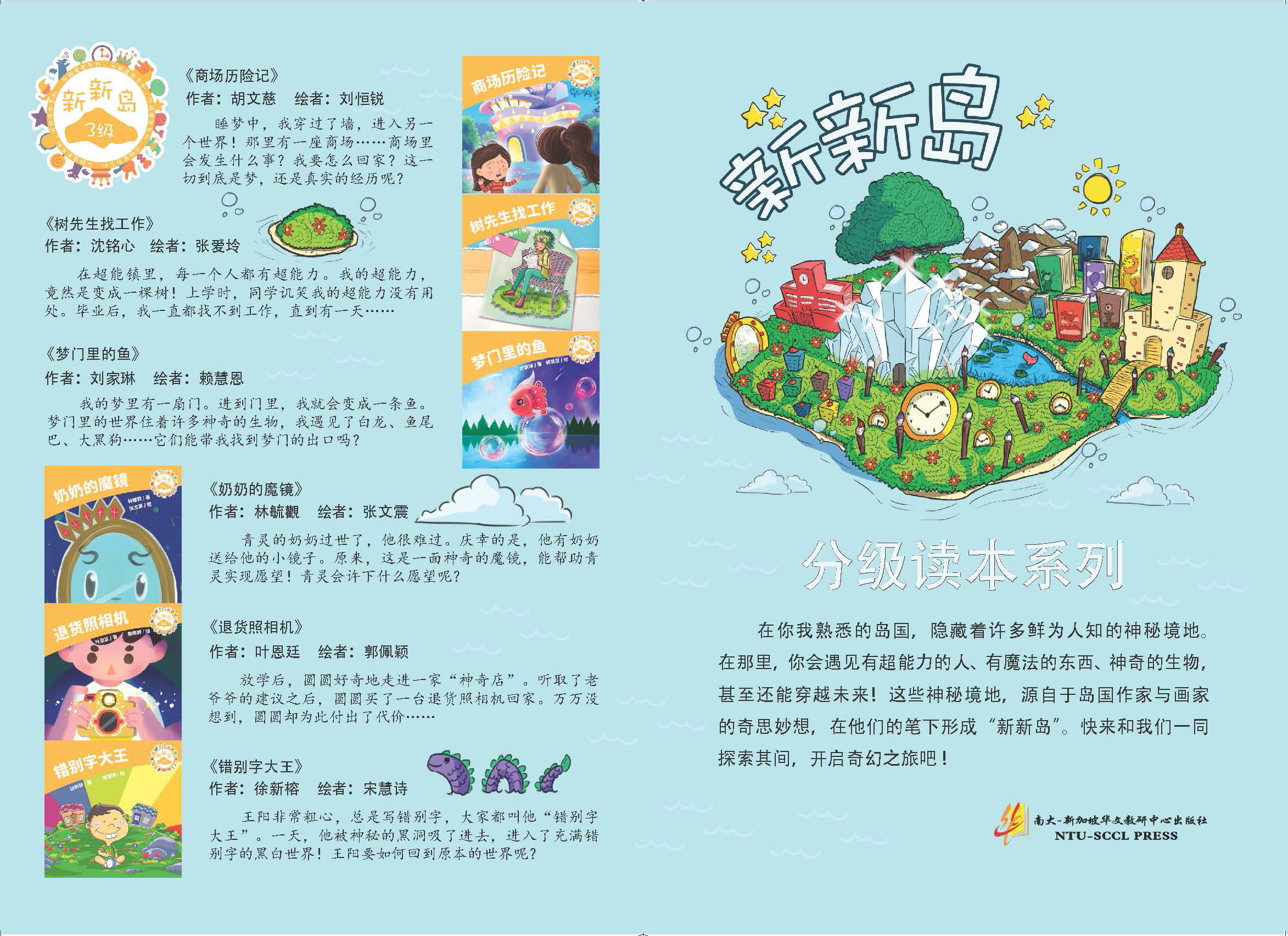 《新新岛》分级读本系列中的故事为2016年"创意无限"全国儿童故事创作大赛得奖作品。该系列读本分为六个级别,每个级别有六本,总共36本书,适合本地学前儿童和小学生阅读。其中,一、二级读本特别标注拼音。家长和教师可以根据儿童的华文阅读水平和学习进度由浅入深,循序渐进地选择合适的读本。