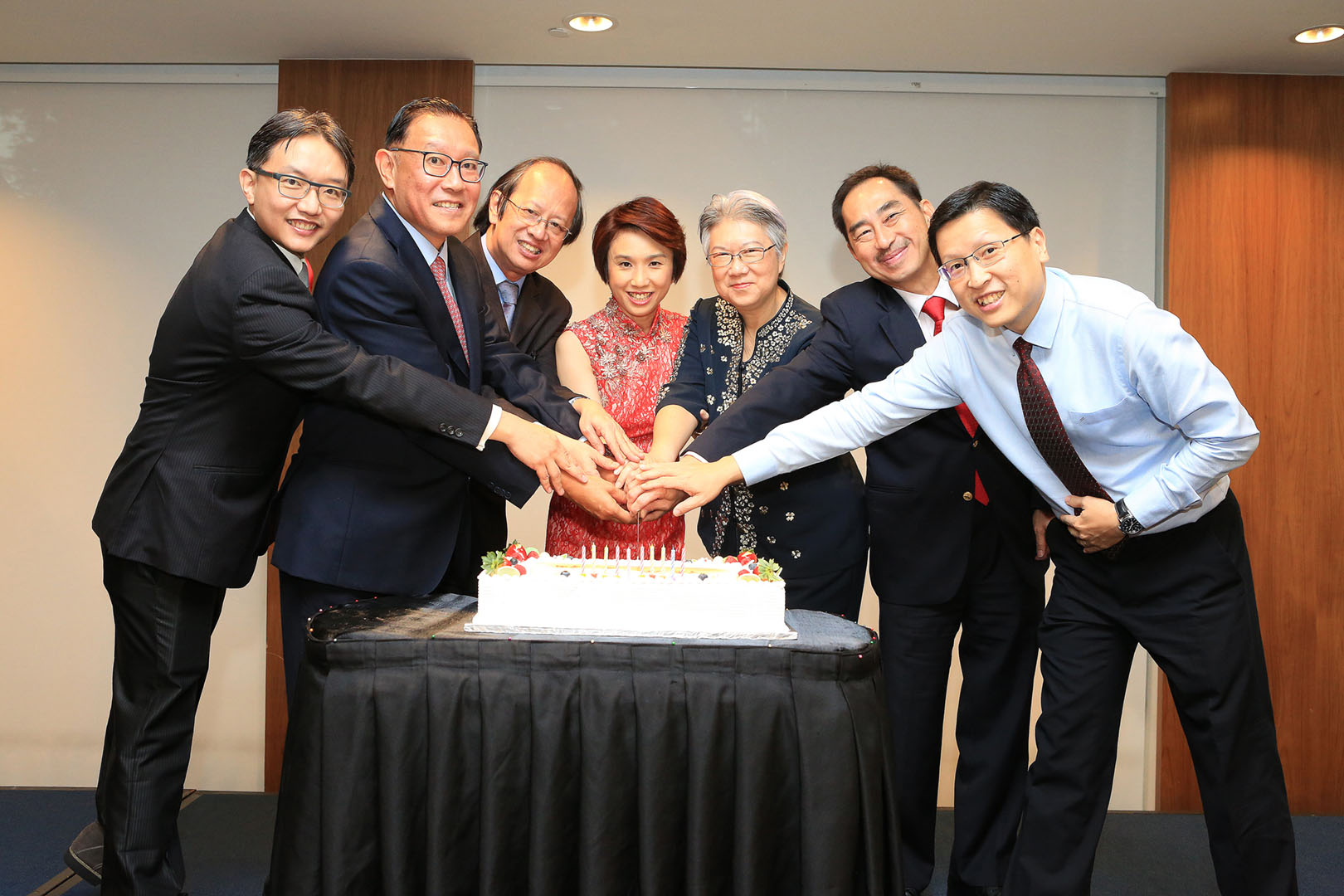 左起:陈志锐博士(教研中心院长,研究与发展)、符传丰博士(教研中心院长)、陈之权博士(教研中心学术顾问)、刘燕玲女士(教育部兼人力部高级政务次长)、何品女士(教研中心董事主席)、王斯芸先生(教育总司长)、孙振炜先生(教研中心董事)